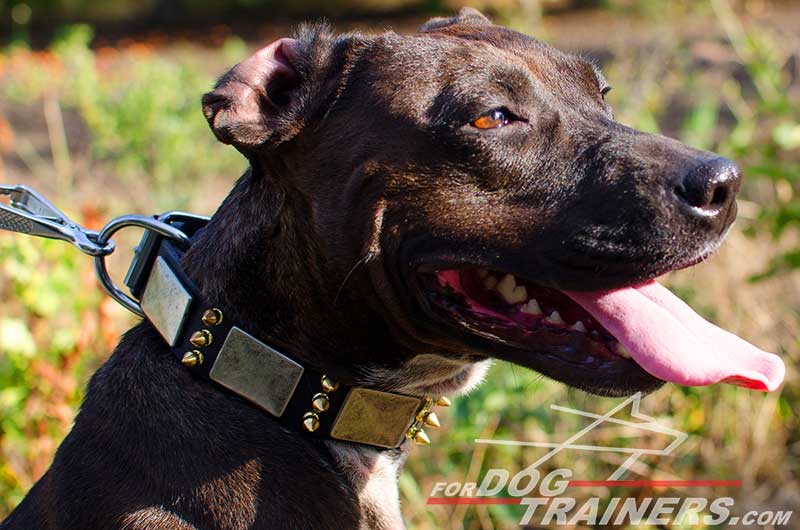 Brass Spikes and Nickel Plates on Walking Pitbull Collar