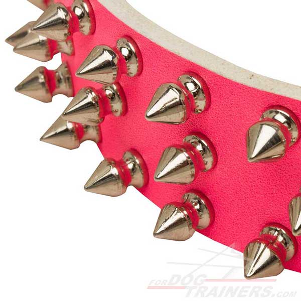 - :: Pink Leather Dog Collar with Nickel Spikes for Daily Walking